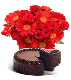 12 red roses and 12 red gerbera in a bunch type bouquet that shows how thoughtful are you and a chocolate cake for your sweetness.