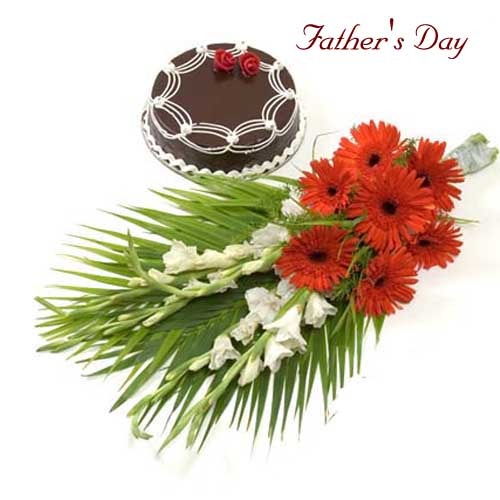 Bunch of vibrant orange gerberas and mix flower with chocolate cake.