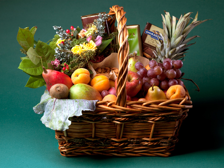 Express your deepest condolences with a gift of comforting nourishment. 6 items fresh fruit, nuts, lindt chocolate,vochelle chocolate box and flowers.