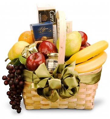 A gift of distinction filled with the most delicious assortment of foods for any occasion. An elegant handled basket holds the freshest fruits, such as oranges, apples, kiwi, pears, bananas, and grapes. The fruits are complemented by savory snacks such as gourmet canned items , cheeses, and crackers. For a crowning touch, we add a selection of candies or chocolates. Exact basket and components may vary by season, delivery location, and size ordered.