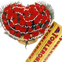 A beautiful arrangement of 3 dozen red roses in a heart shape basket with ( 6 packs x 50 gm each)toblerone that'll make her feel really special.